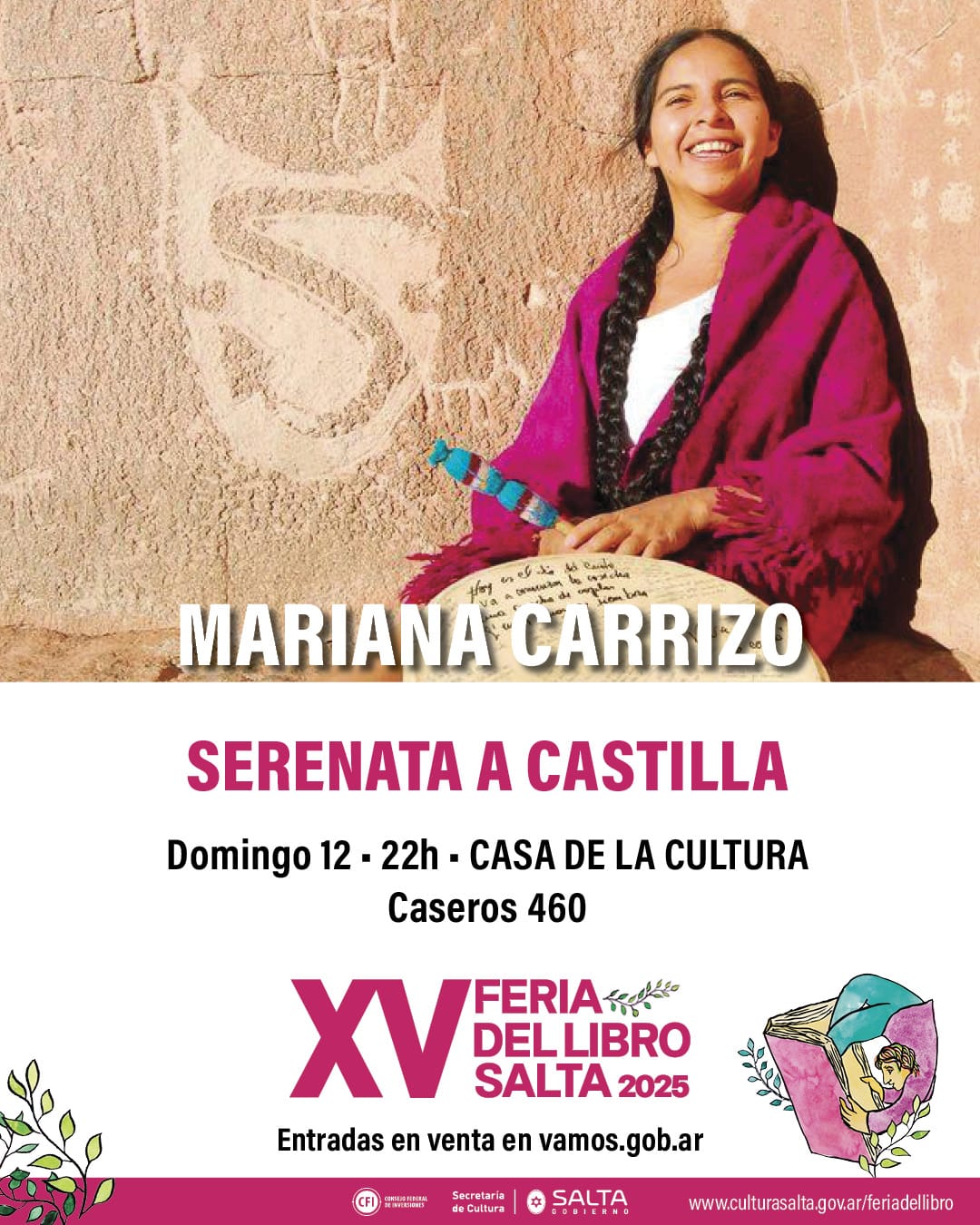 En el marco de la FERIA DEL LIBRO SALTA 2025 la artista Mariana Carrizo presenta "Serenata a Manuel Castilla" un espectáculo en copla y guitarras (con arreglos musicales de Migue Rivaynera), poetas y cantores invitados. La cita será el domingo 12 de octubre en Caseros...