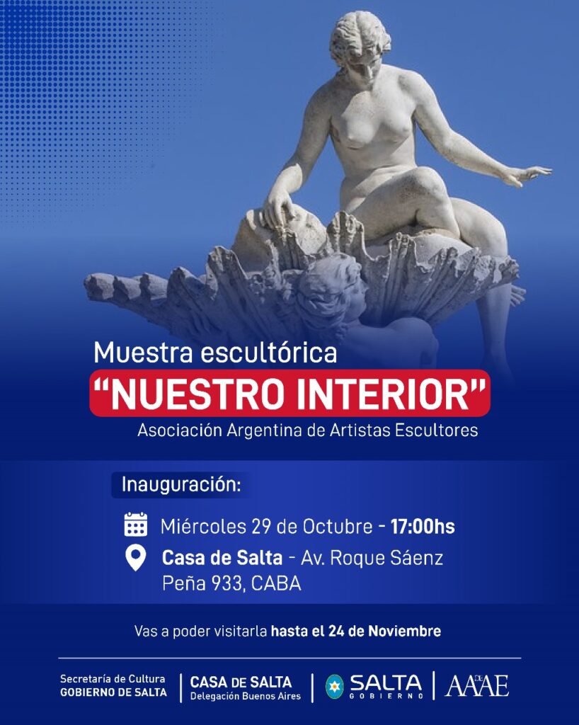 Este miércoles 29 de octubre a las 17 hs, la Casa de Salta inaugurará la muestra escultórica “Nuestro Interior”, organizada por la Asociación Argentina de Artistas Escultores, con el acompañamiento de la Subsecretaría de Patrimonio Cultural de la Provincia, dependiente de la Secretaría de Cultura de Salta.