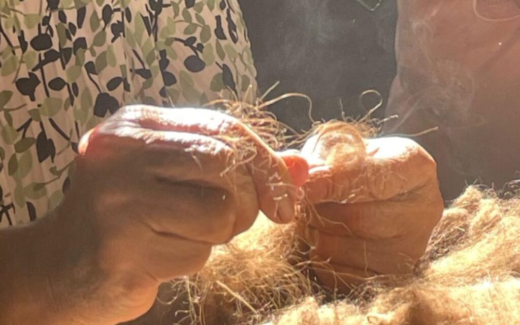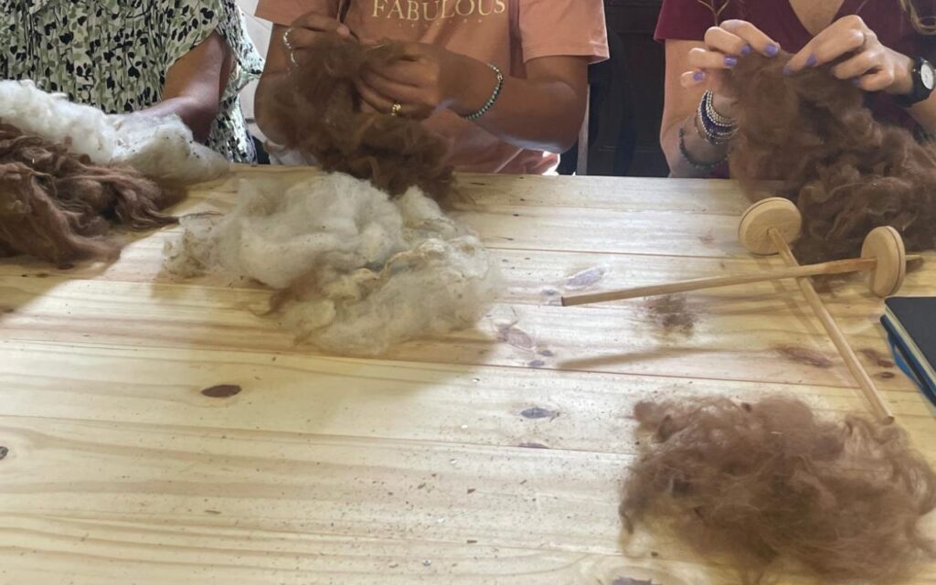 Durante la jornada, las participantes pudieron introducirse en el proceso completo del hilado artesanal, abordando contenidos como la preparación de fibras, técnicas con huso, tipos de hilado y terminaciones, además del reconocimiento de distintas fibras naturales y sus usos. La propuesta incluyó instancias de explicación teórica, demostraciones en vivo y trabajo guiado.