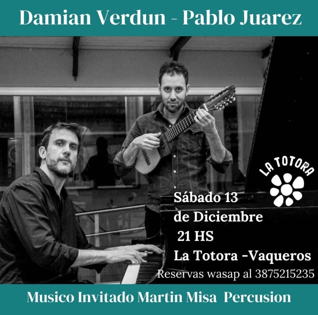 La Totora Espacio Cultural presentará una noche imperdible el sábado 13 de diciembre a las 21, cuando los músicos rosarinos Damián Verdún y Pablo Juárez lleguen a Vaqueros para ofrecer un concierto íntimo en dúo, acompañado por la participación especial de Martín Misa en percusión. El encuentro tendrá lugar en la sala ubicada en Pasaje El Astillero 2 y se extenderá hasta las 23.