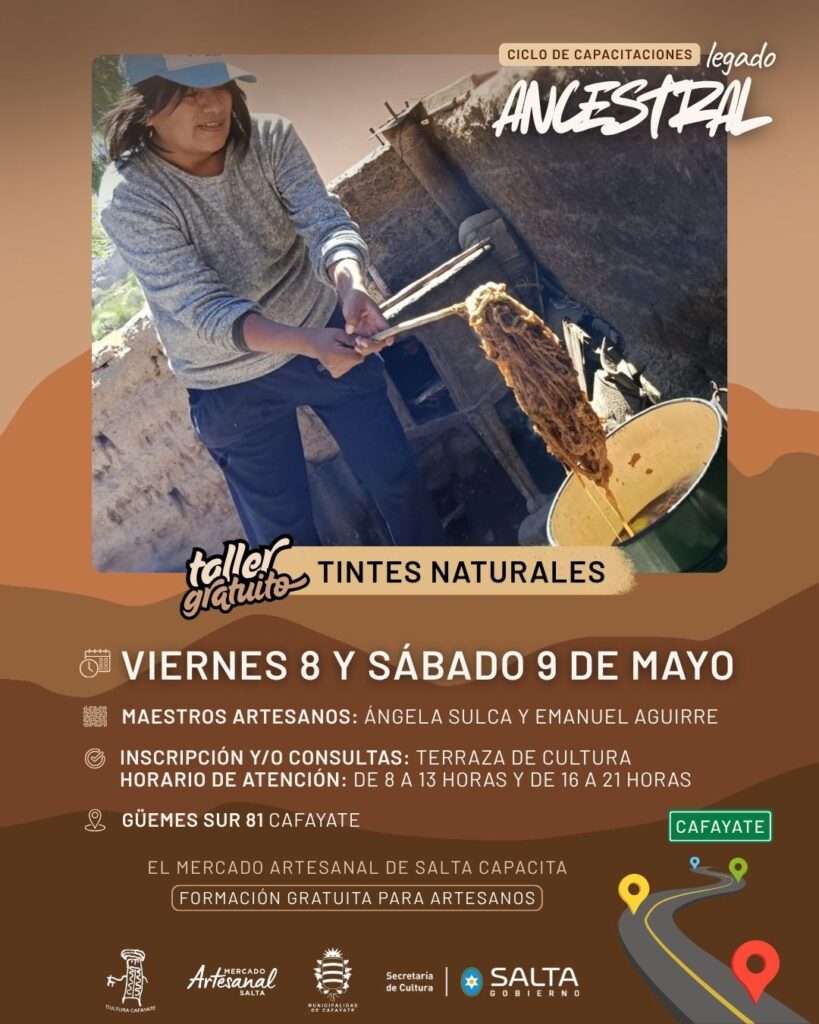 El Mercado Artesanal de Salta en forma conjunta con la Municipalidad de Cafayate lleva adelante una nueva propuesta del ciclo “Legado Ancestral”, con la realización de un taller de Tintes Naturales, a cargo de los maestros artesanos Ángela Sulca y Emanuel Aguirre, quienes compartirán con artesanos del Valle Calchaquí conocimientos vinculados a las fibras textiles y saberes ancestrales sobre el teñido natural utilizando recursos naturales de la zona.