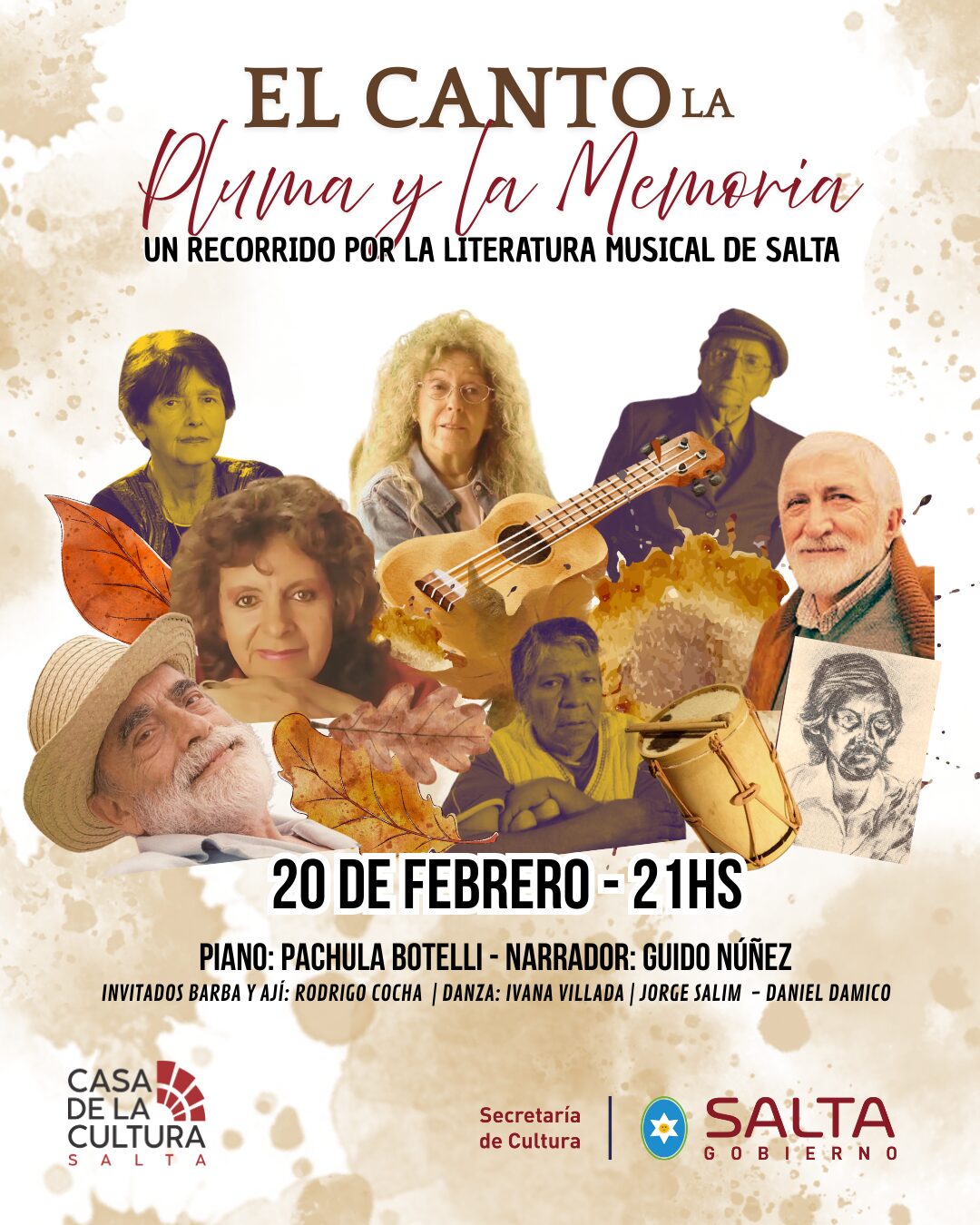 Casa de la Cultura CapitalEl próximo 20 de febrero a las 21 horas, la Sala Juan Carlos Dávalos de la Casa de la Cultura abrirá sus puertas para vivir una velada dedicada a la memoria y la identidad provincial con el recital “El canto, la pluma y la memoria”. La propuesta invita a recorrer la literatura musical de Salta a través de un diálogo sensible entre piano, narración, danza y canto.