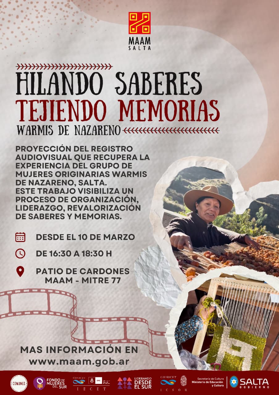 Museo de Arqueología de Alta Montaña – MAAM CapitalEl Museo de Arqueología de Alta Montaña (MAAM) proyectará el audiovisual “Hilando Saberes, Tejiendo Memorias. Warmis de Nazareno” desde el 10 de marzo, de 16:30 a 18:30, en la Sala de Cardones, con entrada libre y gratuita.