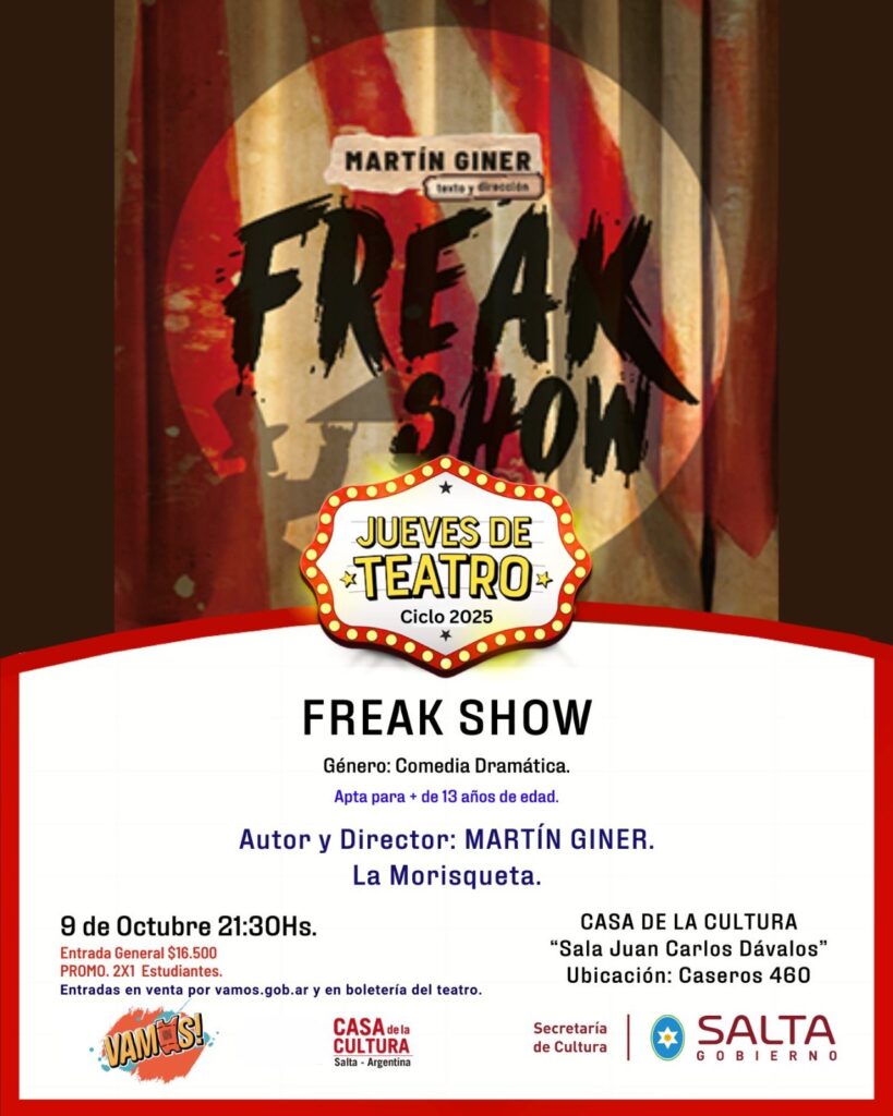 El jueves 9 de octubre a las 21:30 horas, la Compañía Teatral La Morisqueta presentará "Freak Show" en la Casa de la Cultura (Caseros 460) .