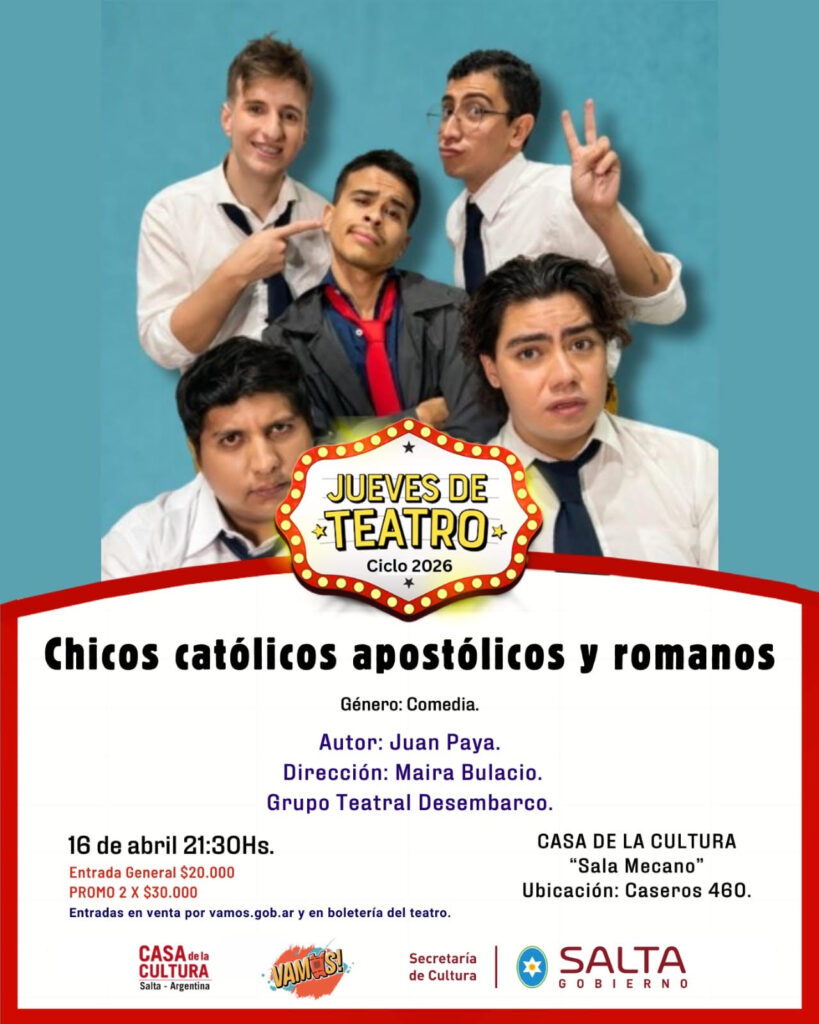 El jueves 16 de abril a las 21:30 horas, se presentará la obra Chicos Católicos Apostólicos Romanos en Salta en el marco del ciclo Jueves de Teatro.