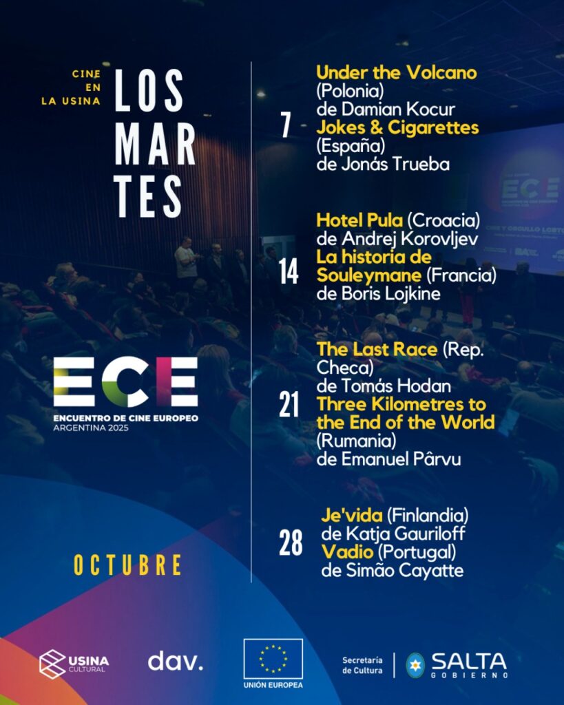 La XXI edición del Encuentro de Cine Europeo en Argentina (ECE), es organizado por la Unión Europea y socios locales, bajo el lema “Miradas que nos acercan, historias que nos transforman”. Se realiza a lo largo de este mes, con producciones de 17 países de la Unión, y funciones presenciales en 11 ciudades del país, entre las que se encuentra Salta.