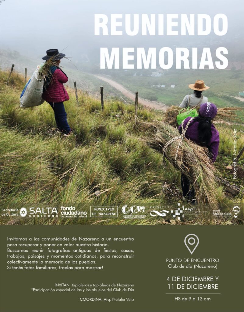 En esta primera instancia se invita a participar del Encuentro Comunitario “Reuniendo Memorias” el 4 y 11 de diciembre en el Club de Día de Nazareno de 9 a 12 h. El objetivo es reunir fotografías de distintas épocas para reconstruir los relatos vinculados a ellas, garantizando una mirada situada.