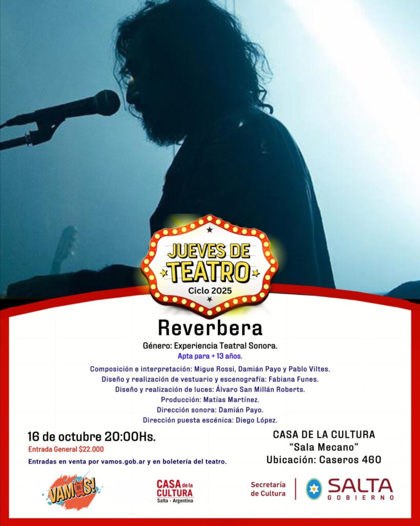 El jueves 16 de oactubre a las 20 horas se  realizará una nueva edicion del ciclo "Jueves de Teatro" en la Sala  Mecano de la Casa de la Cultura (Caseros 460) . En esta oportunidad con una propuesta innovadora, un concierto musical inmersivo: REVERBERA.