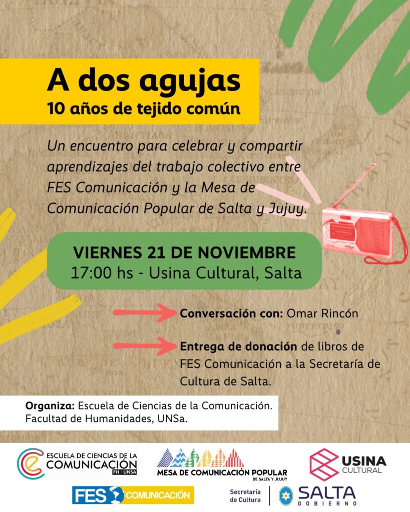 Desde la Escuela de Ciencias de la Comunicación por medio de la cátedra de Comunicación Popular y Alternativa de la Facultad de Humanidades de la Universidad Nacional de Salta, la Mesa de Comunicación Popular de Salta y Jujuy y el proyecto FES Comunicación de la Fundación Friedrich Ebert, invitan a la comunidad a participar del evento “A dos agujas: 10 años de tejido común”, un encuentro para celebrar una década de trabajo articulado en torno a la comunicación como derecho, la construcción colectiva y la soberanía comunitaria.