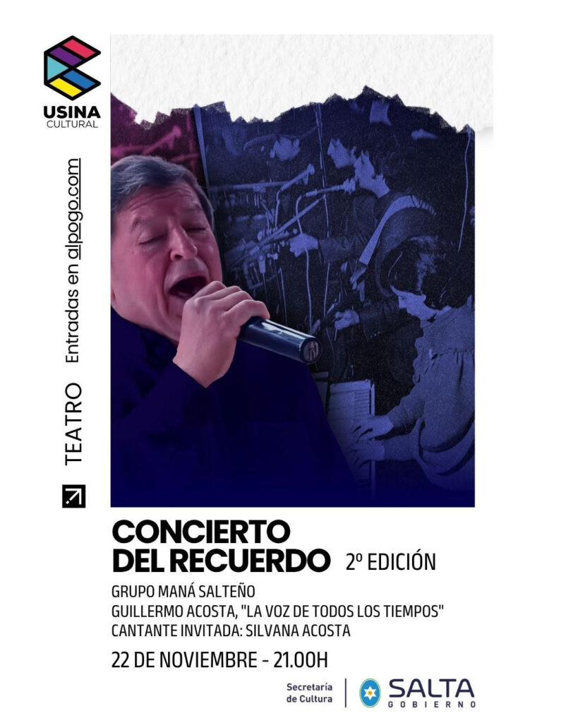 El sábado 22 a las 21, el Teatro presentará la segunda edición del Concierto del recuerdo, organizado por la productora Soníria. El público podrá disfrutar de Maná Salteño, Guillermo Acosta, conocido como La Voz de Todos los Tiempos, y la participación especial de la cantante invitada Silvana Acosta. Las entradas están a la venta en alpogo.com.