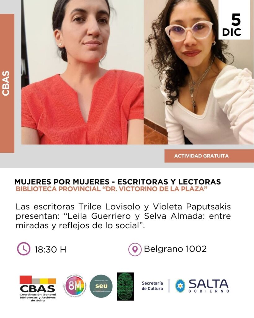 Este ciclo culmina en el mes de diciembre, en el que tendremos la oportunidad de escuchar a las escritoras Violeta Paputsakis y Trilce Lovisolo, quienes presentarán: “Leila Guerriero y Selva Almada: entre miradas y reflejos de lo social”.