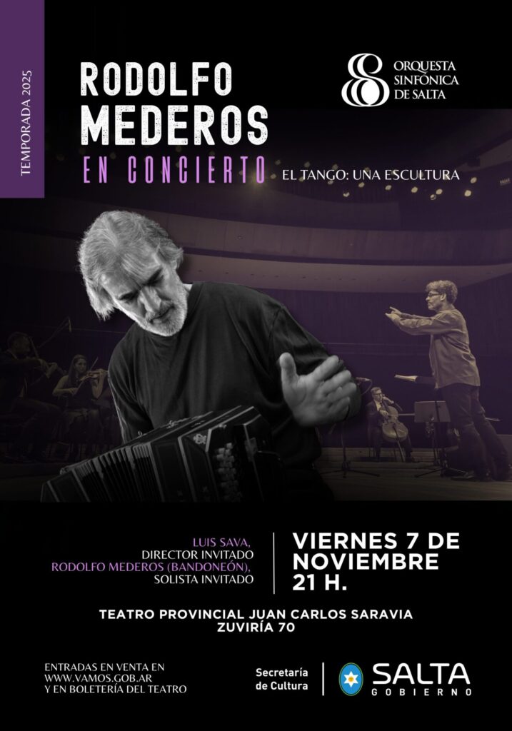 La Orquesta Sinfónica de Salta continúa su Temporada 2025 con la presentación del reconocido bandoneonista y compositor Rodolfo Mederos, quien ofrecerá un concierto titulado “El tango: una escultura”. La función tendrá lugar el viernes 7 de noviembre a las 21 horas en el Teatro Provincial Juan Carlos Saravia, bajo la dirección del maestro invitado Luis Sava.